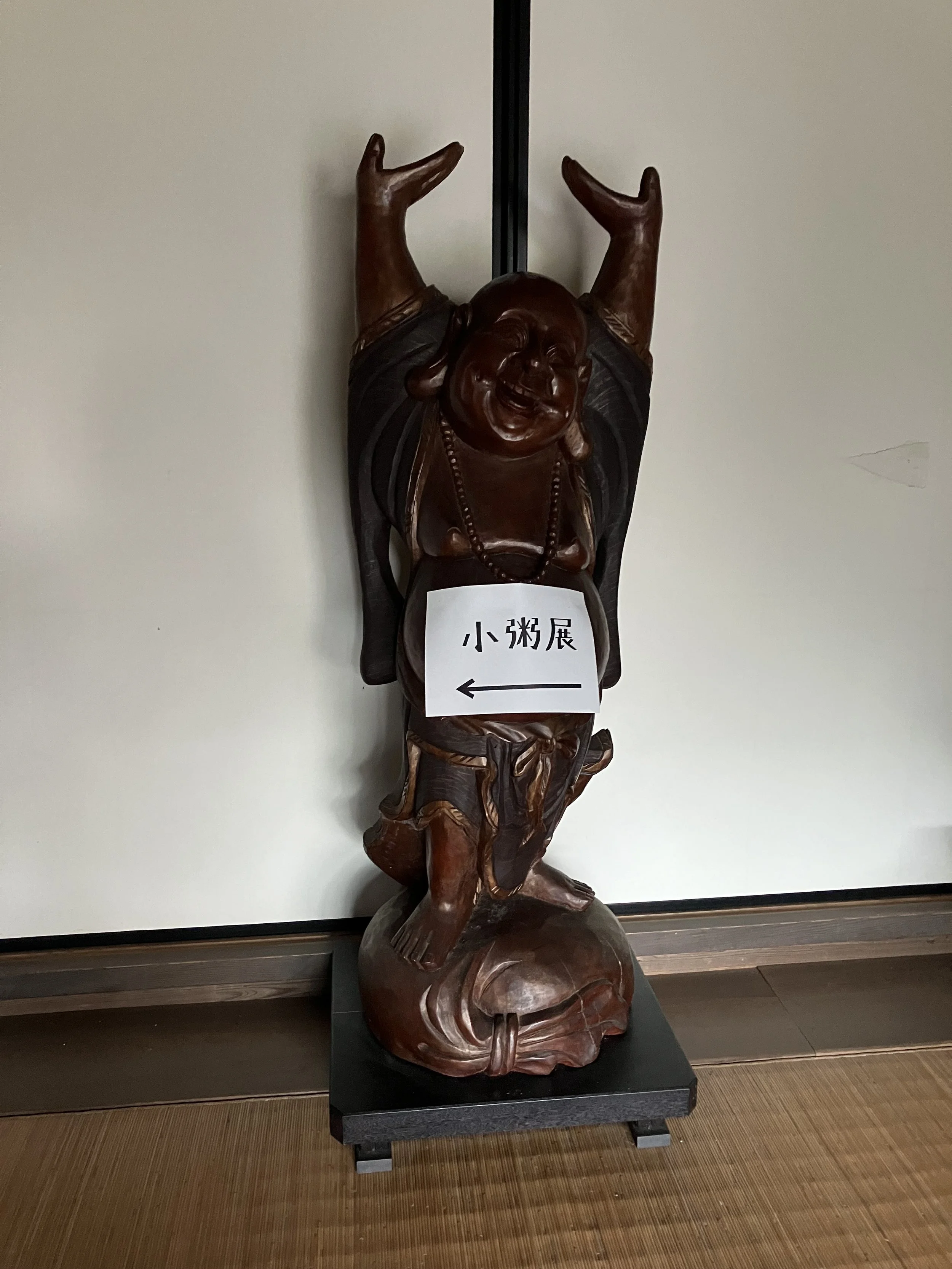まず午前中指定の荷物が洞春寺さまへ届いていない。この時点で午後2時。コールセンターへ問い合わせ追跡を頼むと、「すぐドライバーから連絡します!」とのこと。折り返し掛けてきたドライバーさんは「玄関前に荷物出しておいてください、すぐいきます」。むむむ!いや、頼んだのは追跡であり、集荷じゃないです、と伝えると憮然とした様子で「え?オペレーターにもう一回掛けさせます」とおっしゃる。オペレーターさんに再度荷物の追跡を頼むも、「あー、午前中指定の文字を見落としてますね」とさらり。「本日中にお届けしますので」というので「こちらは仕事なのでどうか頼みます」と伝え、仕方がないので洞春寺さまの観音堂にて観世音菩薩普門品偈を読誦しましたら、そこから30分以内に届きました。観音様〜!!ありがとうございます。日々拝み続けるとこういうときにスパーン!と験が通る。心から感謝いたします。念彼観音力!!そのあとも、演奏会で本堂をまるっと使われるつもりでいると聞き、当初の予定していた本堂ではなく奥の書院を使わせていただく流れになりました。そこにおられた木喰仏の釈迦如来像。ほー、これはお呼びくださいましたね。とそんなこんなで展示準備いたしました。一気に書いてすみません。泰然自若たれ、ですねえ。